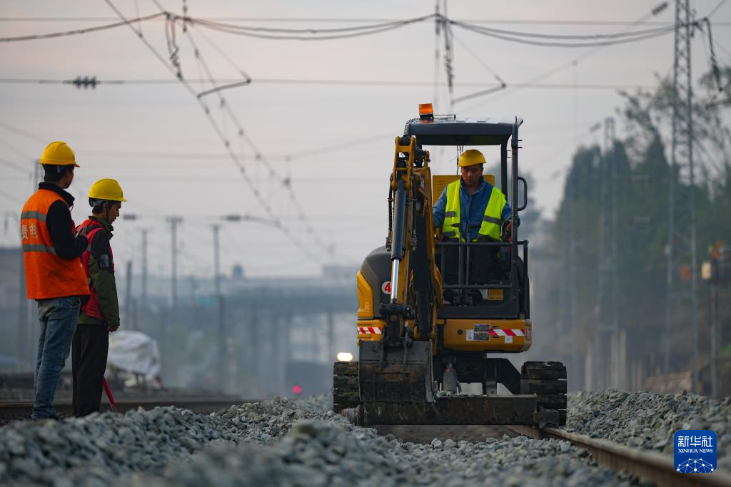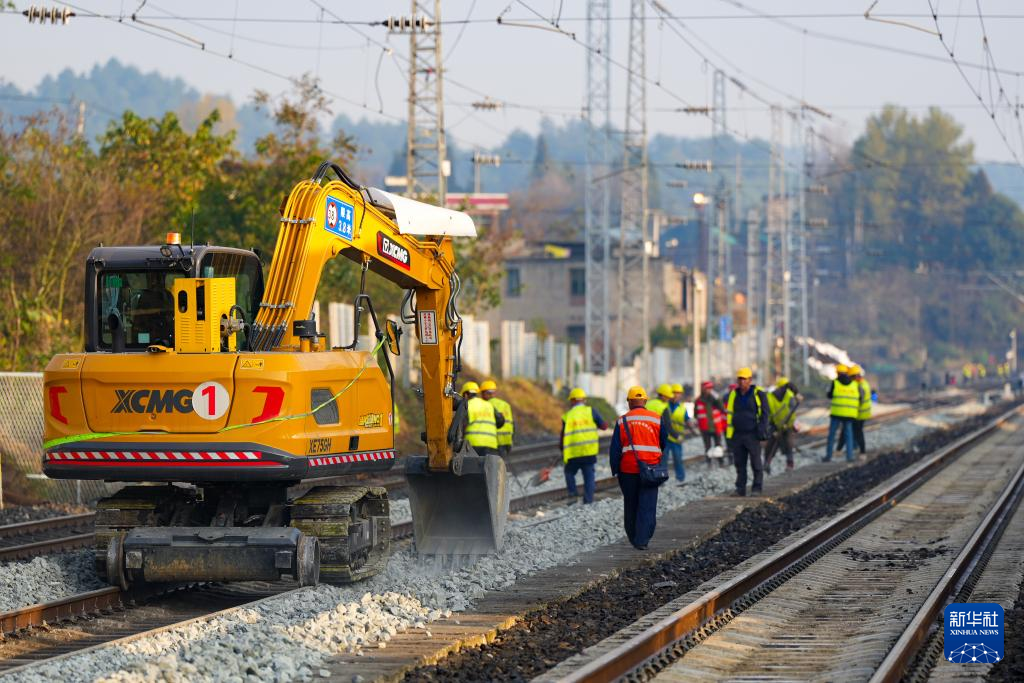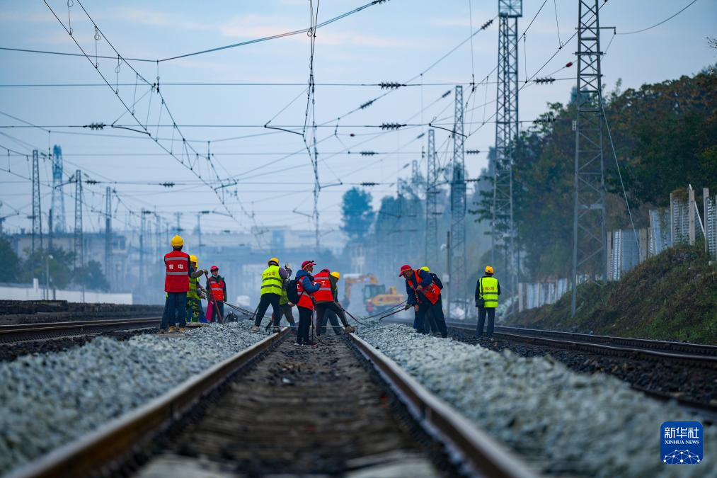 11月9日,施工人员在川黔铁路扎佐站集中修作业现场作业。新华社发(龙建睿 摄)