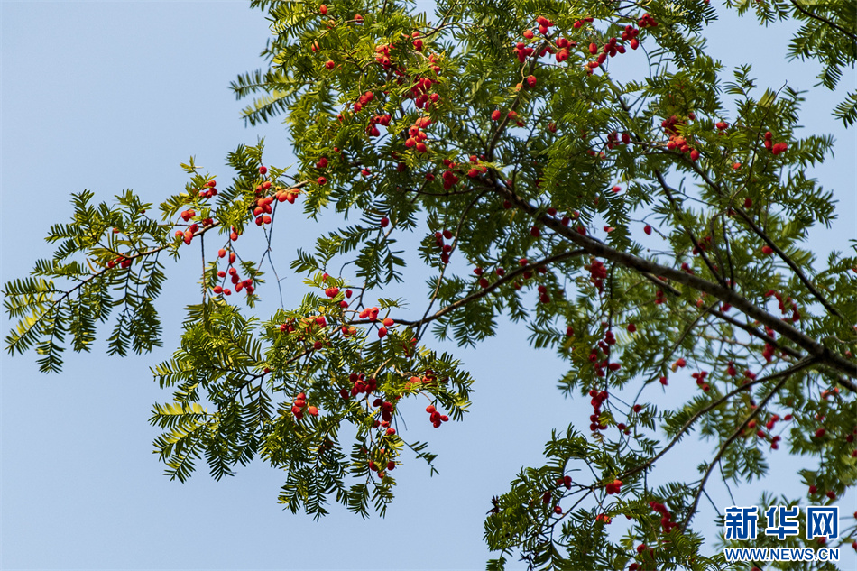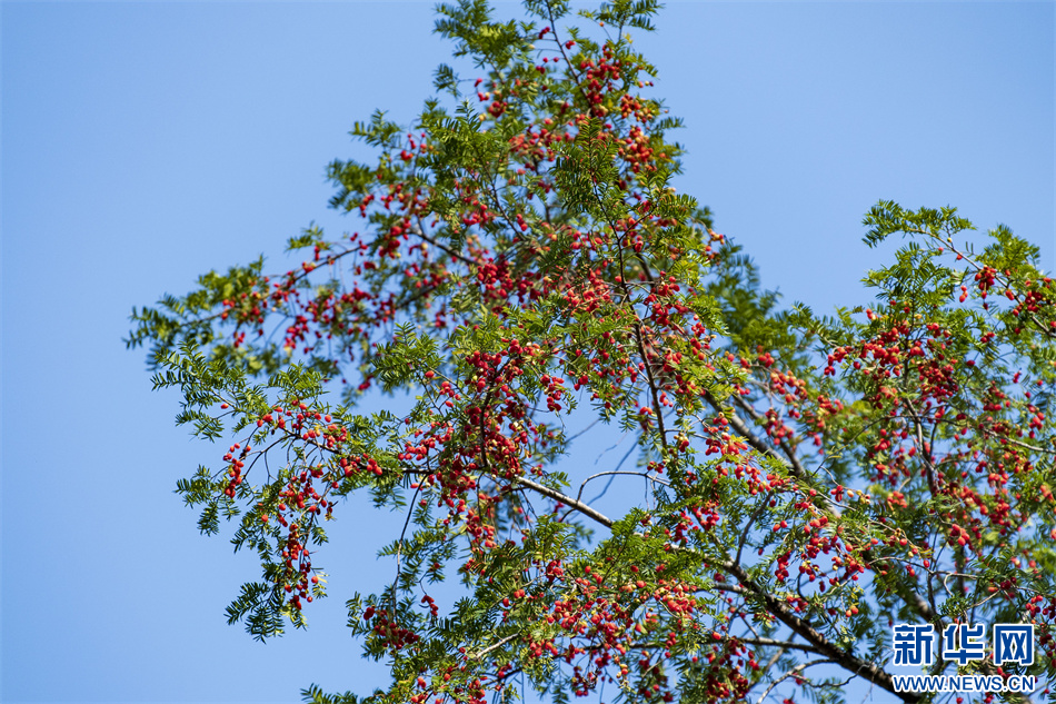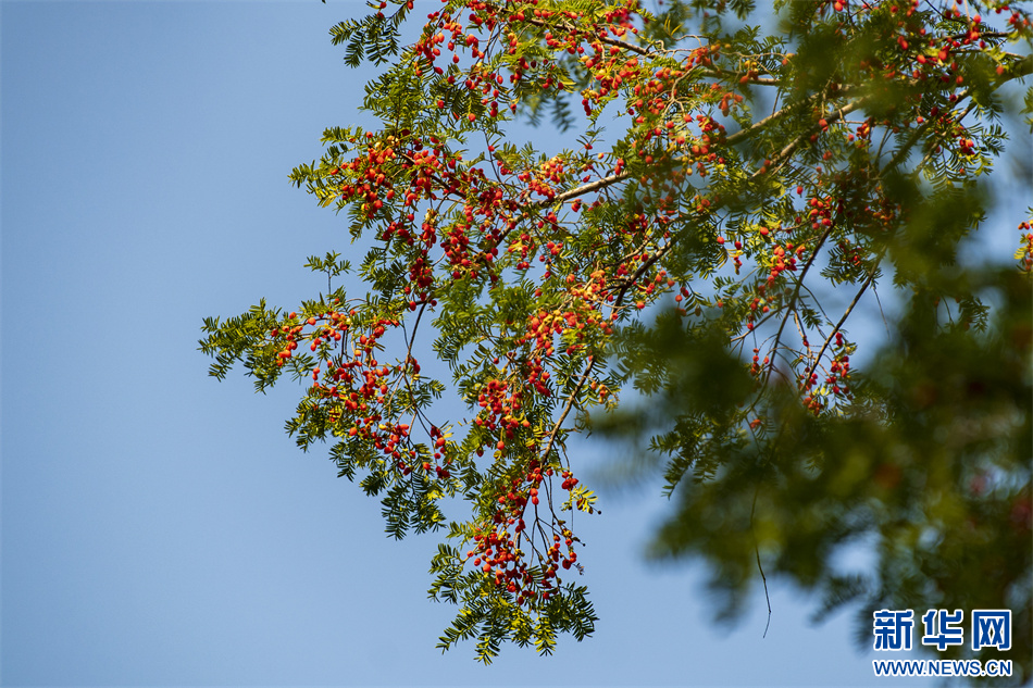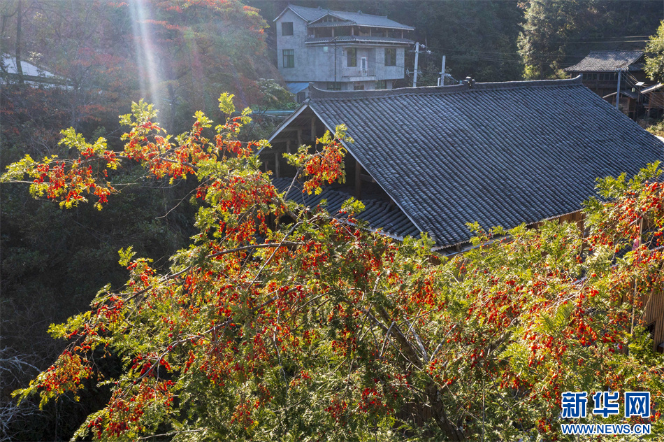 初冬时节,贵州省黔东南苗族侗族自治州从江县谷坪乡银下侗寨百年红豆杉硕果累累,晶莹剔透,在阳光照射下红光闪烁。