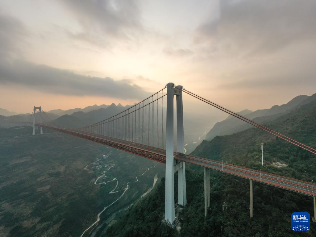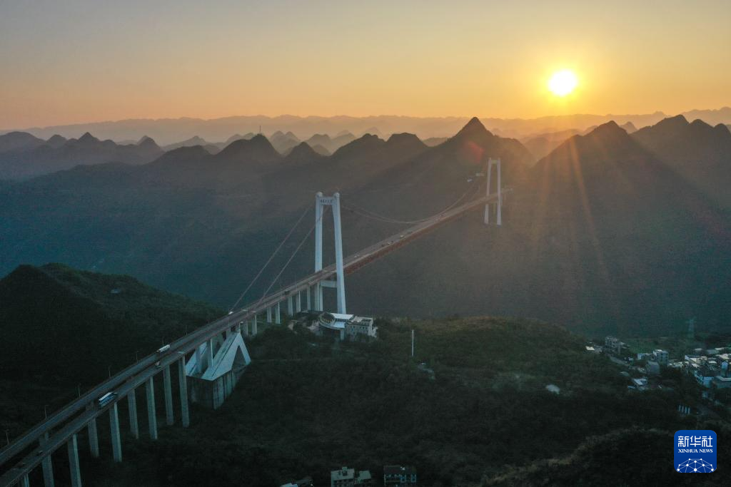 11月14日拍摄的晨曦中的贵州坝陵河大桥(无人机照片)。新华社记者 杨文斌 摄