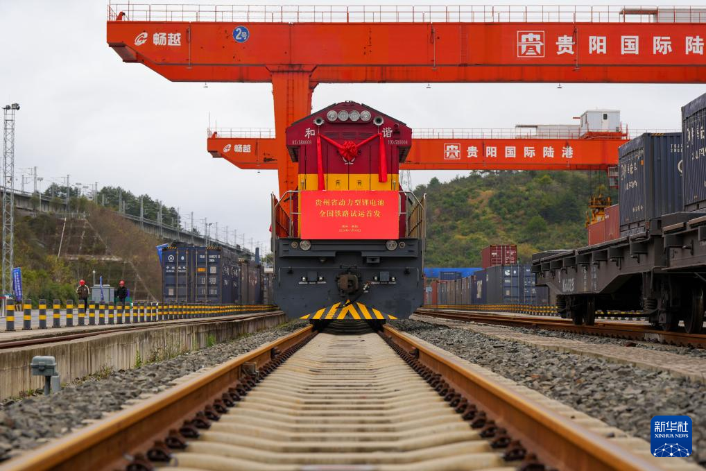 11月19日,一列搭载动力锂电池的列车停靠在贵阳国际陆港都拉营站。新华社发(龙建睿 摄)
