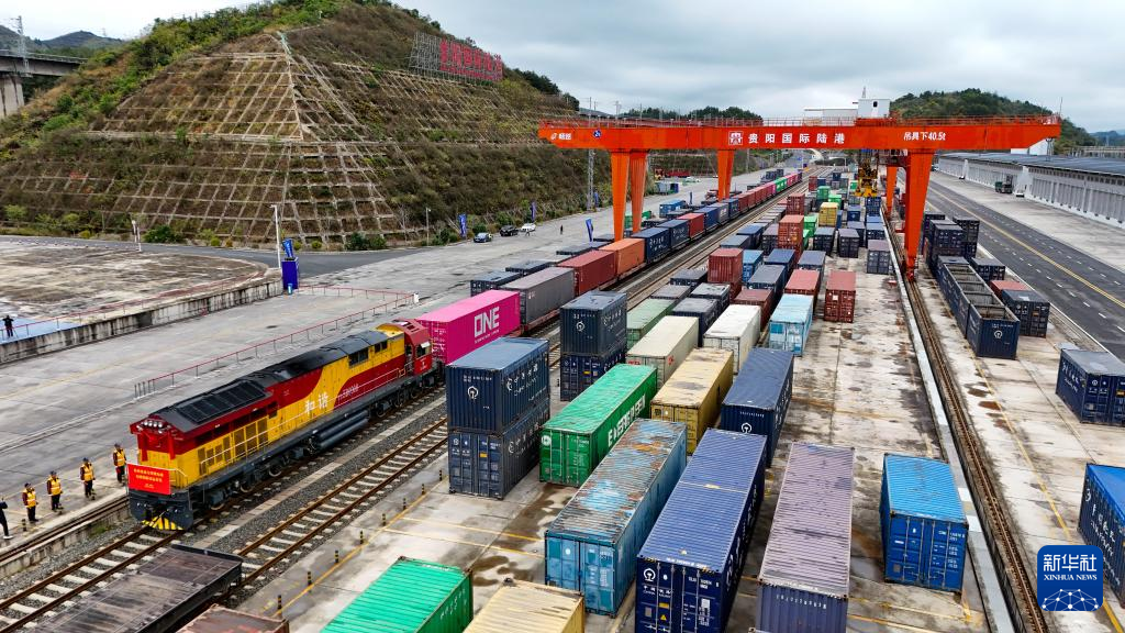 11月19日,一列搭载动力锂电池的列车停靠在贵阳国际陆港都拉营站。