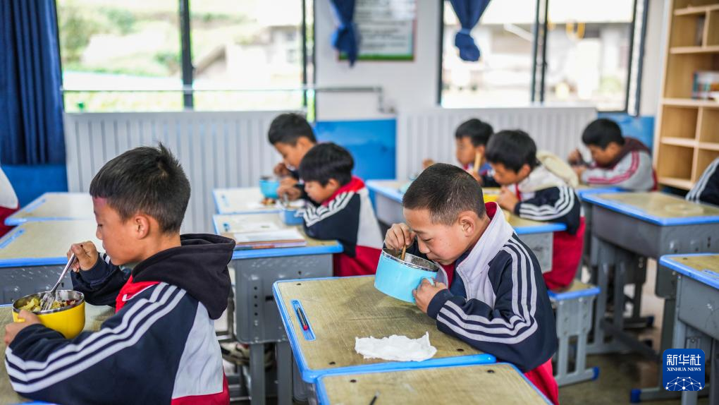 亮岩小学的孩子在供暖的教室内吃午饭(11月21日摄)。新华社记者 陶亮 摄