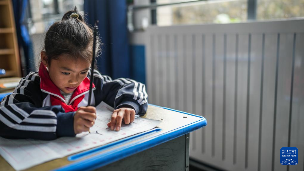 亮岩小学的孩子在供暖的教室内练习写毛笔字(11月20日摄)。新华社记者 陶亮 摄