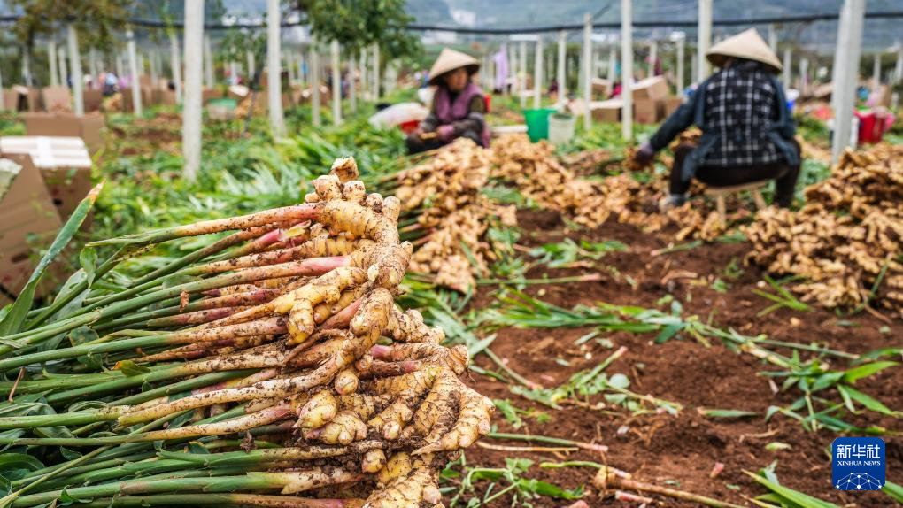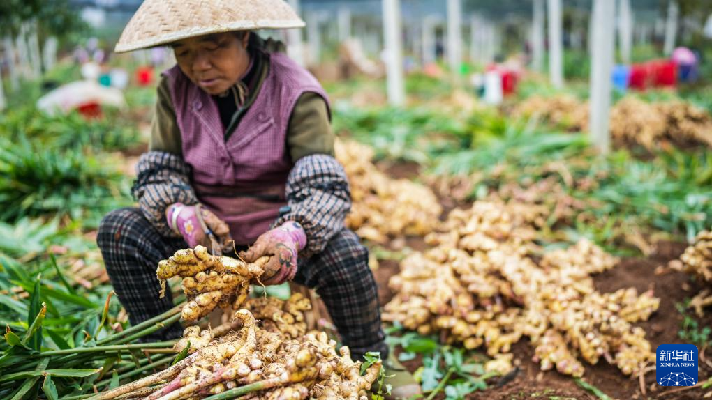 初冬时节,贵州省六盘水市六枝特区木岗镇种植的5000余亩生姜迎来丰收季,当地群众忙着采摘、分拣,田间地头一派繁忙景象。