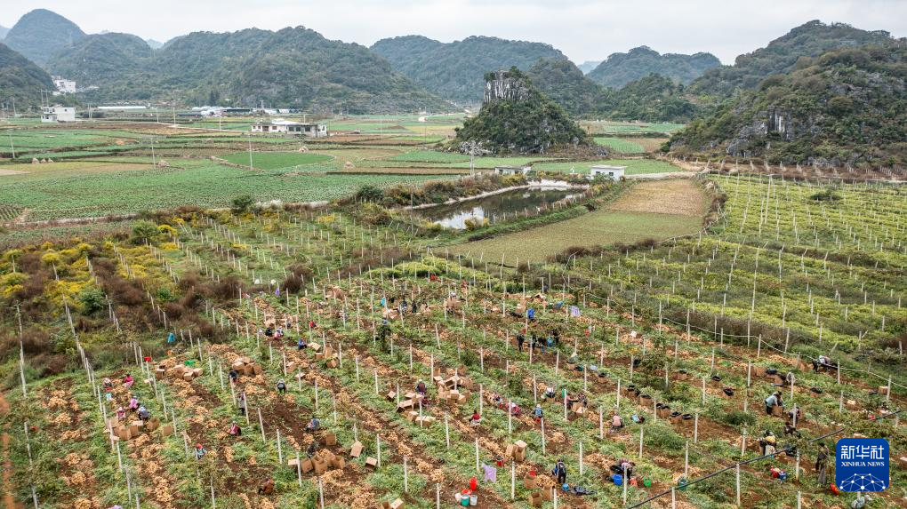 六盘水市六枝特区木岗镇戛陇塘村的农户在采收生姜(11月22日摄,无人机照片)。新华社记者 陶亮 摄