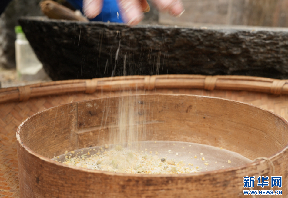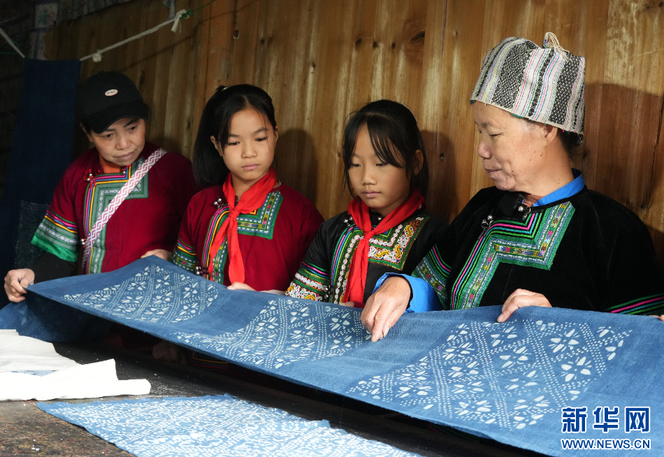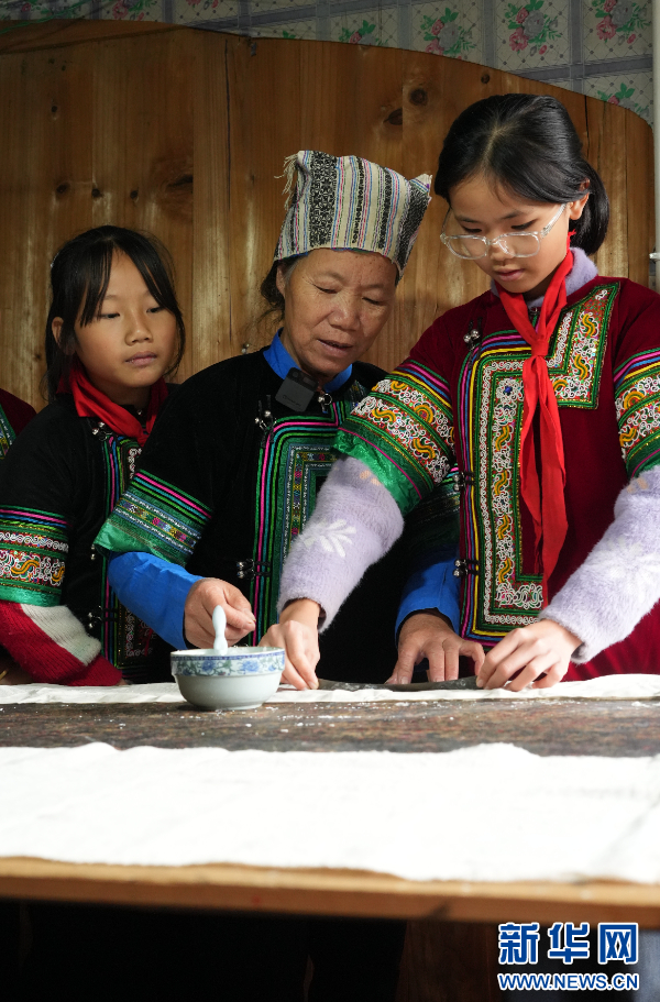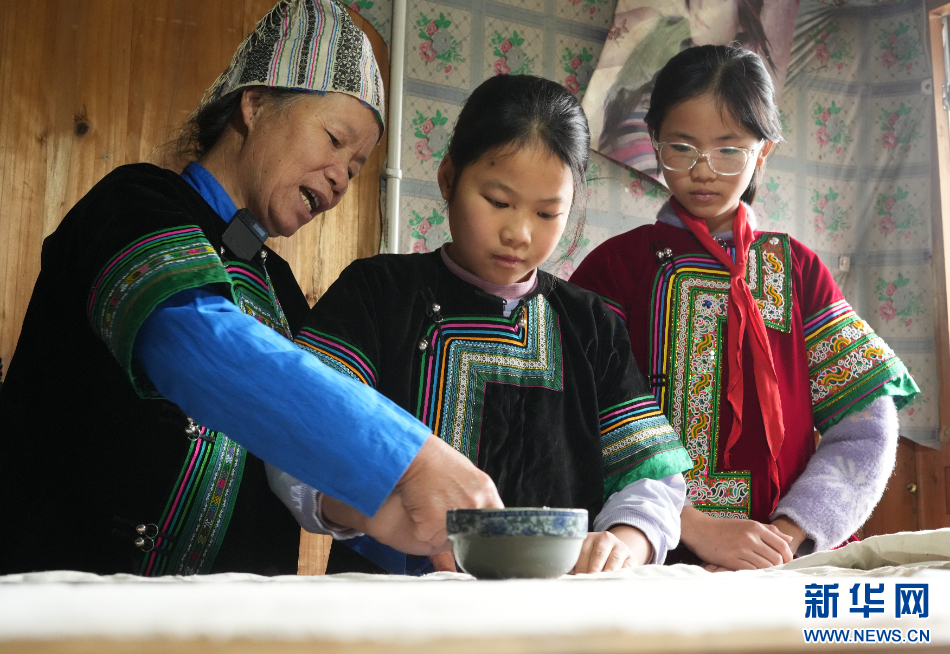 11月22日,在贵州省榕江县朗洞镇色边村,侗族豆染传承人石庆芝向村民传授豆染制作技艺。新华网发(吴化雨 摄)