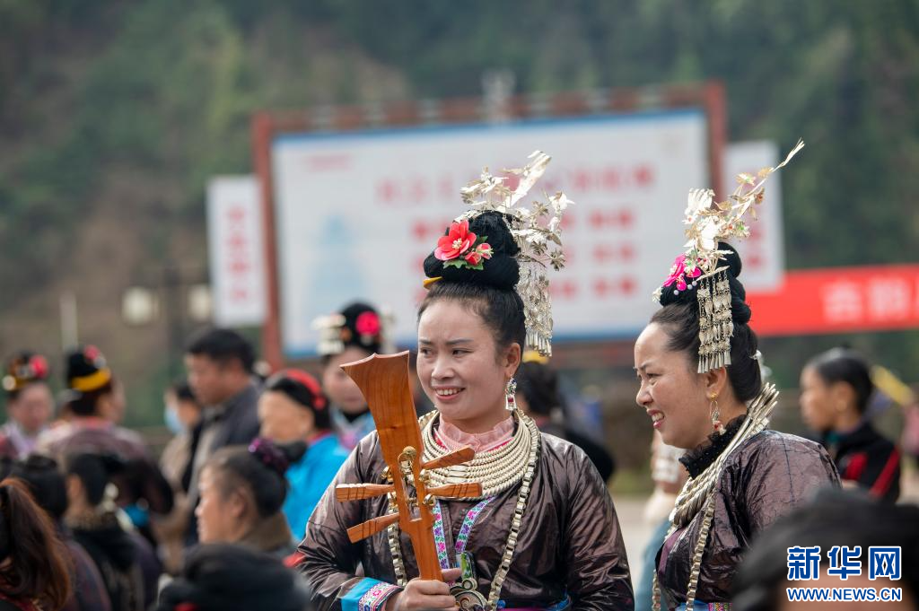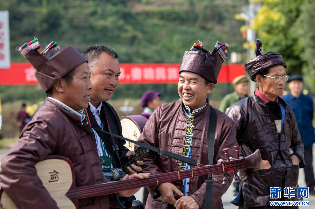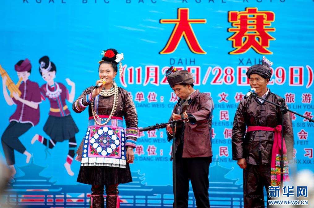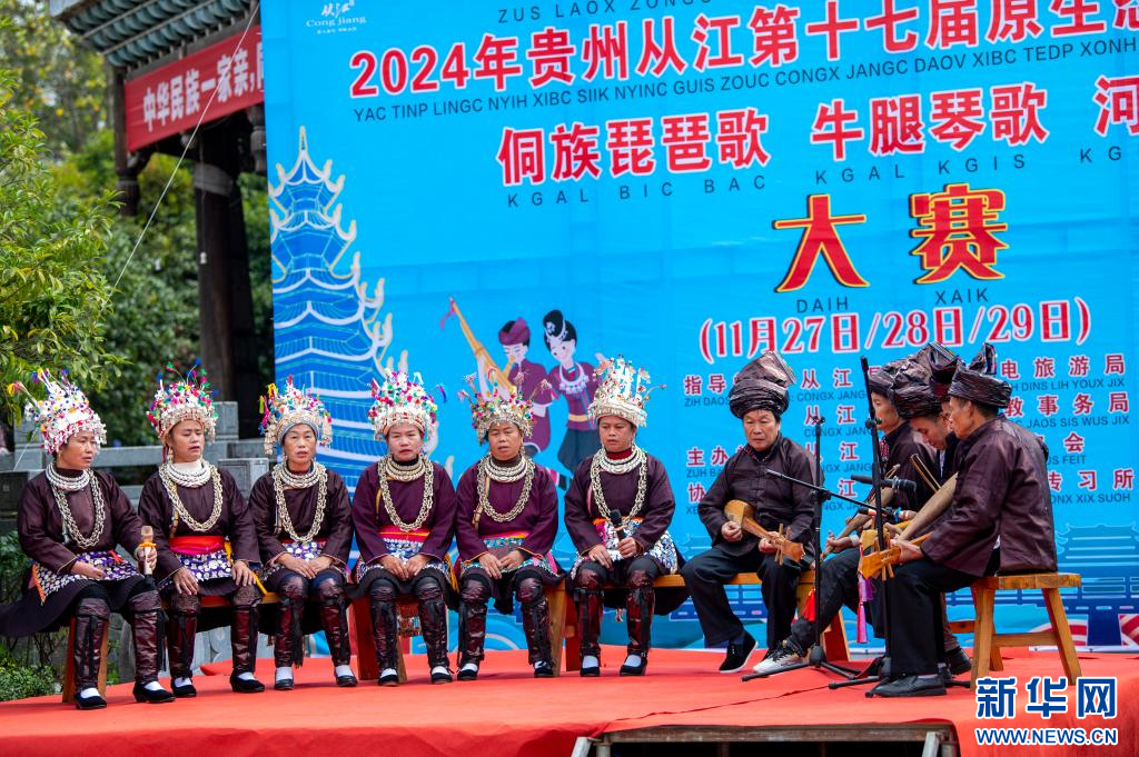 11月27日,在贵州省从江县北上鼓楼广场,一支侗族琵琶歌队在参加比赛。新华网发(吴德军 摄)
