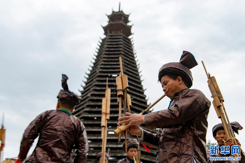 11月27日,芦笙手在贵州省从江县北上鼓楼广场进行表演。新华网发(吴德军 摄)