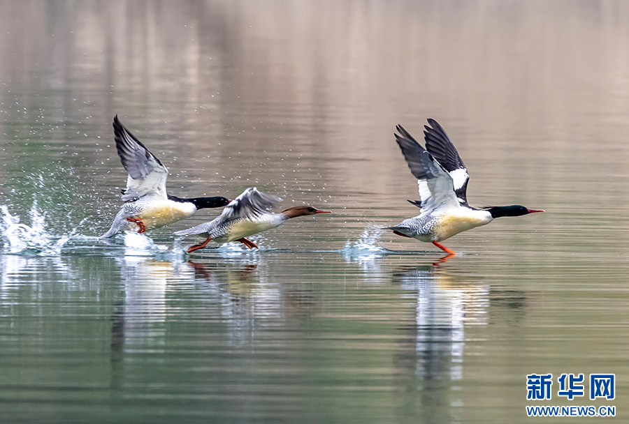 12月1日,在贵州省黔东南苗族侗族自治州施秉县㵲阳河景区,三只中华秋沙鸭在水中嬉戏。新华网发(磨桂宾 摄)
