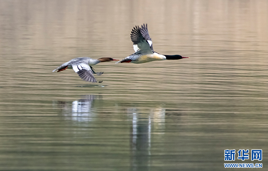 12月1日,在贵州省黔东南苗族侗族自治州施秉县㵲阳河景区,两只中华秋沙鸭在河面飞翔。