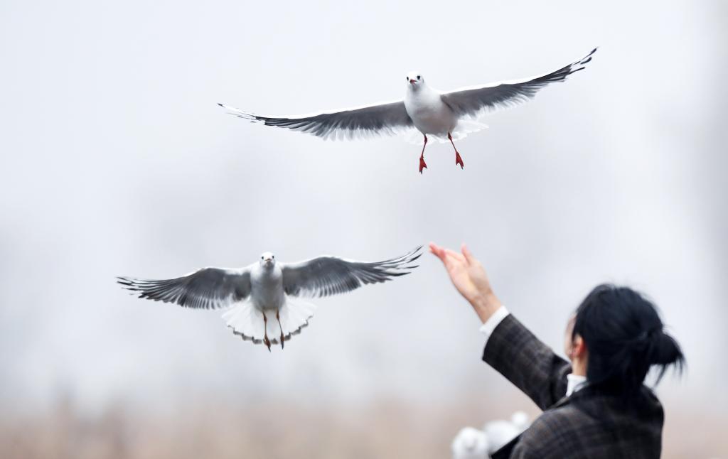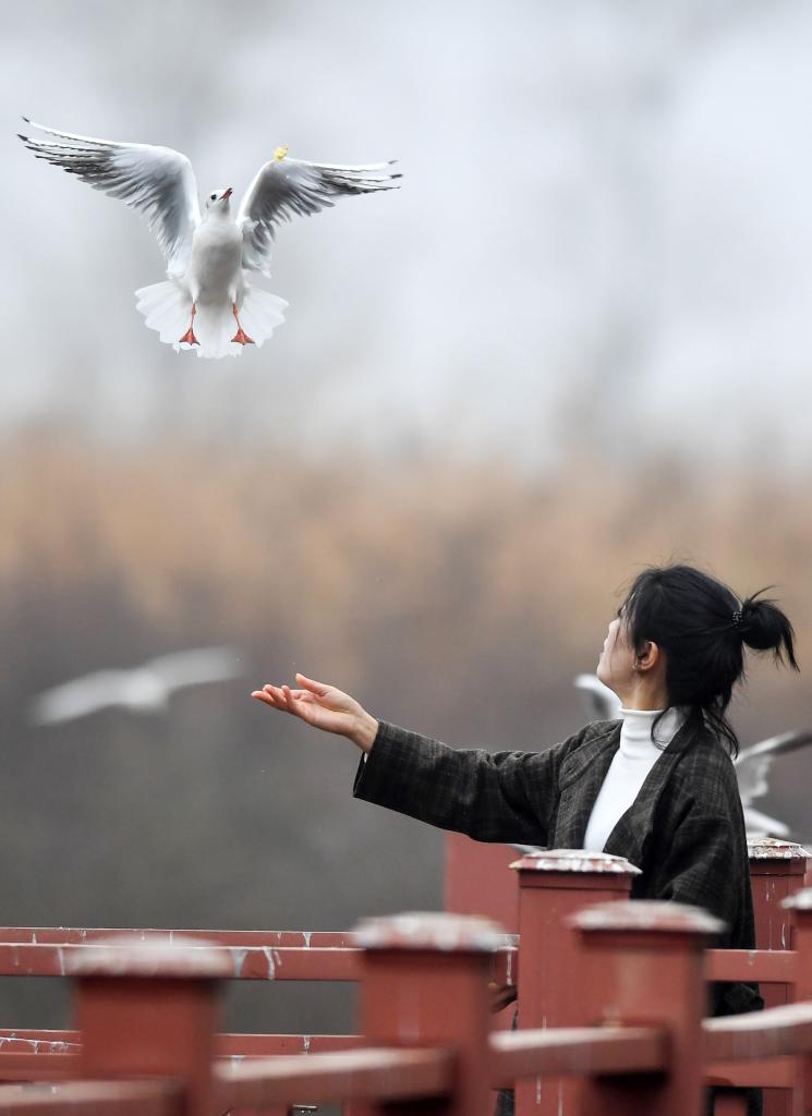 12月17日,游客在贵州草海国家级自然保护区投喂红嘴鸥。