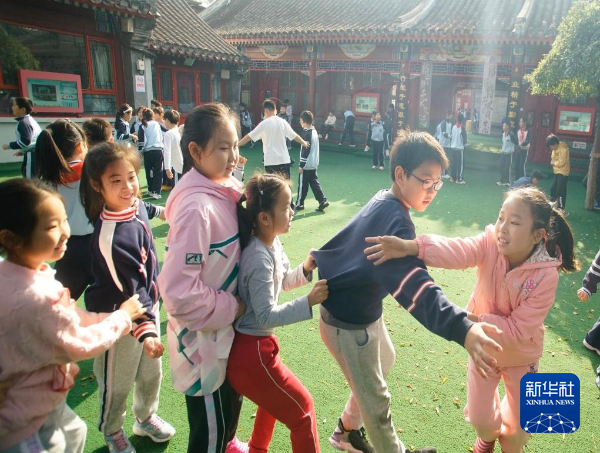 11月14日,北京市黑芝麻胡同小学的学生在课间玩游戏。新华社记者 李欣 摄