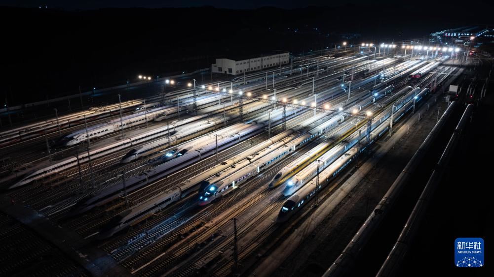 1月13日凌晨,完成检修的动车组列车停靠在贵阳北动车所内(无人机照片)。新华社发(龙建睿摄)