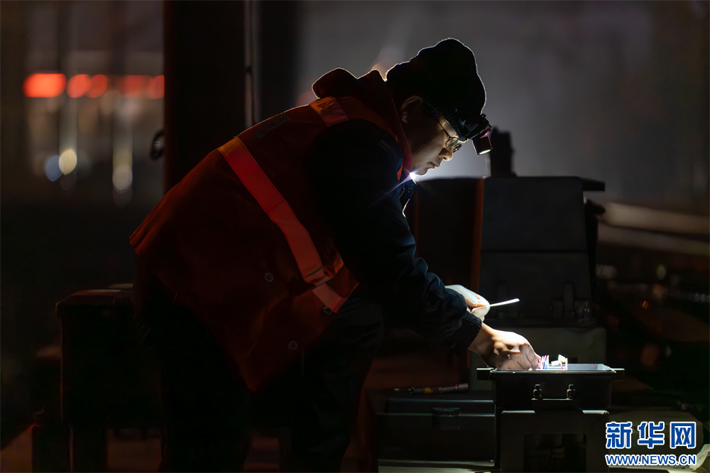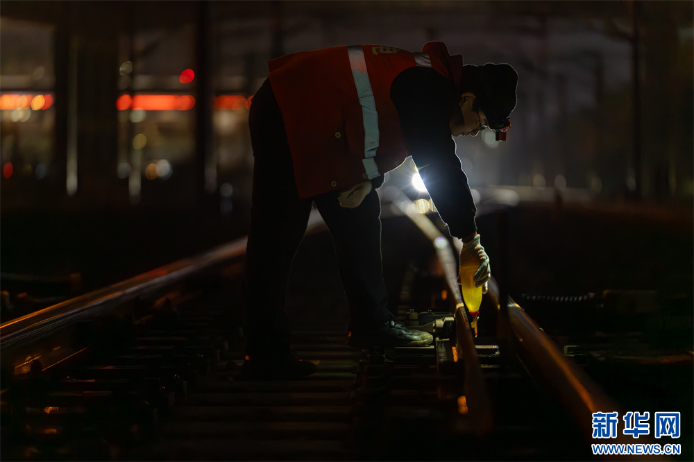 1月14日,中国铁路成都局集团有限公司贵阳电务段职工对道岔进行养护。新华网发(杨隆亚 摄)