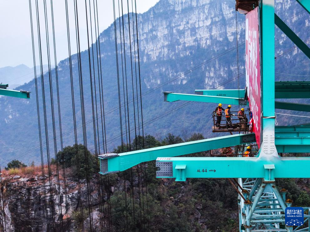 1月14日,工人在为吊装贵州六安高速公路花江峡谷大桥最后一个节段钢桁梁做准备。新华社记者 杨文斌 摄