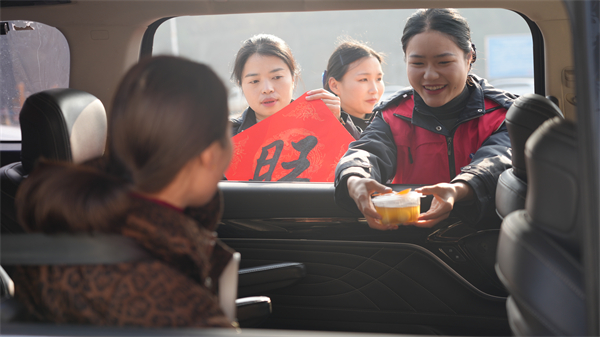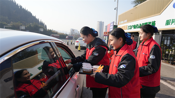 毕节高发公司在收费站、服务区、停车区推出货车司机“爱心餐”,开展情满旅途暖冬服务,向司乘提供路况咨询、热水、方便面、维修工具等便民服务,营造温馨舒适的高速通行环境。遵义、凯里、贵阳、毕节营运中心向司乘发放暖宝贴、汤圆、姜茶等便民物资,发放春运交通安全宣传资料,倡导返乡人员安全出行、文明驾车。铜仁营运中心与当地团委、就业局在收费站外设置返乡就业服务点,为返乡务工人员提供就业咨询服务。都匀、安顺、水城、兴义营运中心依托收费广场、便民服务亭,组织书法爱好者写春联和“福”字,并将春联、“福”字、窗花、小灯笼等送到司乘手中,向司乘送上新年的祝福。“刚到贵州就收到新年礼物,暖宝贴和窗花都非常实用,我都好喜欢。”长途货车张师傅拿着新年礼物开心地说。