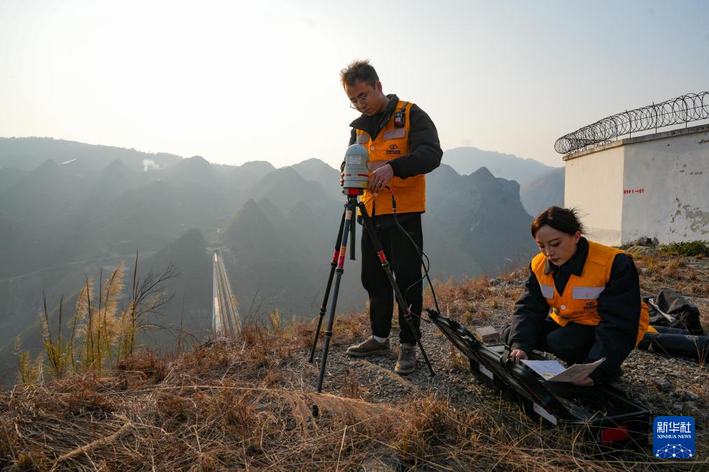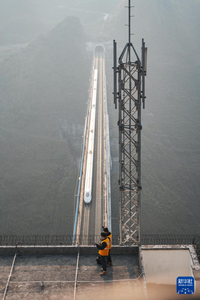 1月15日,贵阳电务段铁路通信工在沪昆高铁北盘江特大桥旁基站测试应急抢险设备。新华社发(龙建睿 摄)
