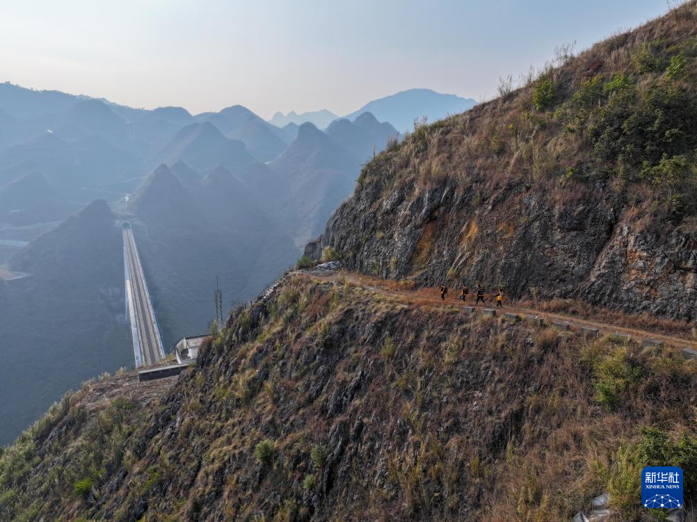1月15日,贵阳电务段铁路通信工徒步前往沪昆高铁北盘江特大桥旁的基站开展排查工作。