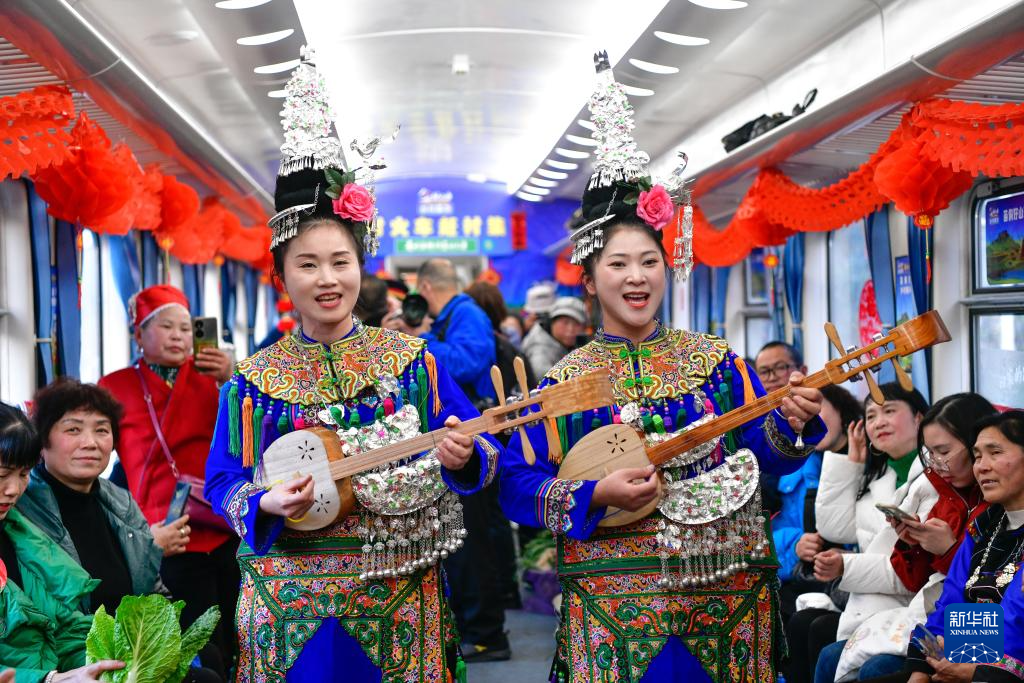 1月18日,少数民族演员在5640次列车上给乘客和村民弹唱侗族琵琶歌。