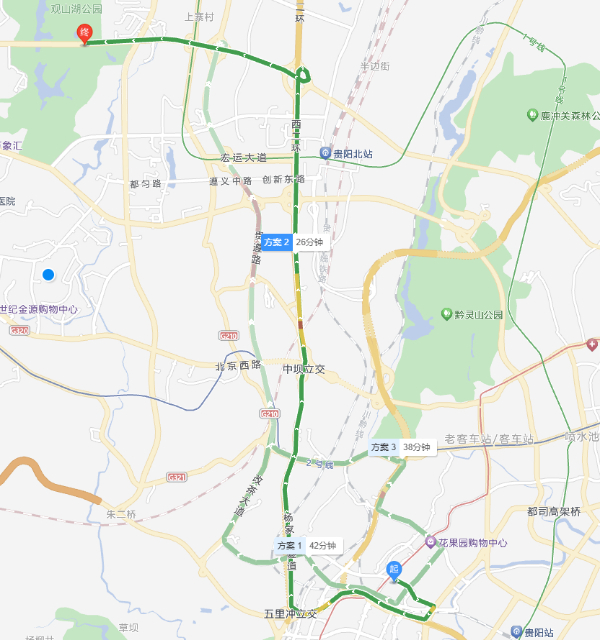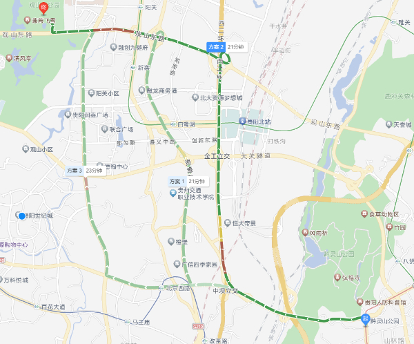 线路走向:黔灵山公园(天怡豪生大酒店对面)——北京西路——西二环——观山东路——民族大联欢广场