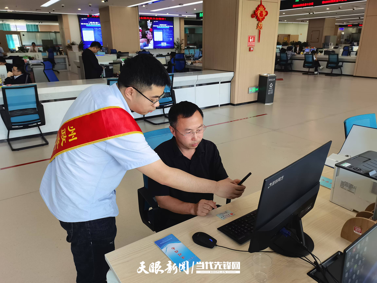 剑河县政务服务中心工作人员正在帮助群众在手机线上操作业务办理。(杨婷 摄)