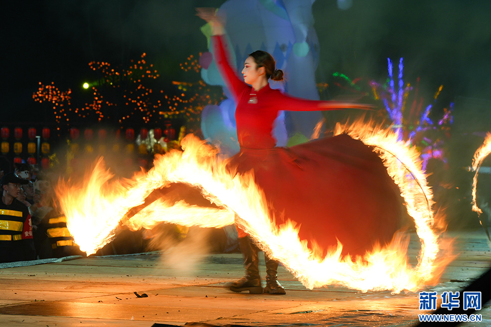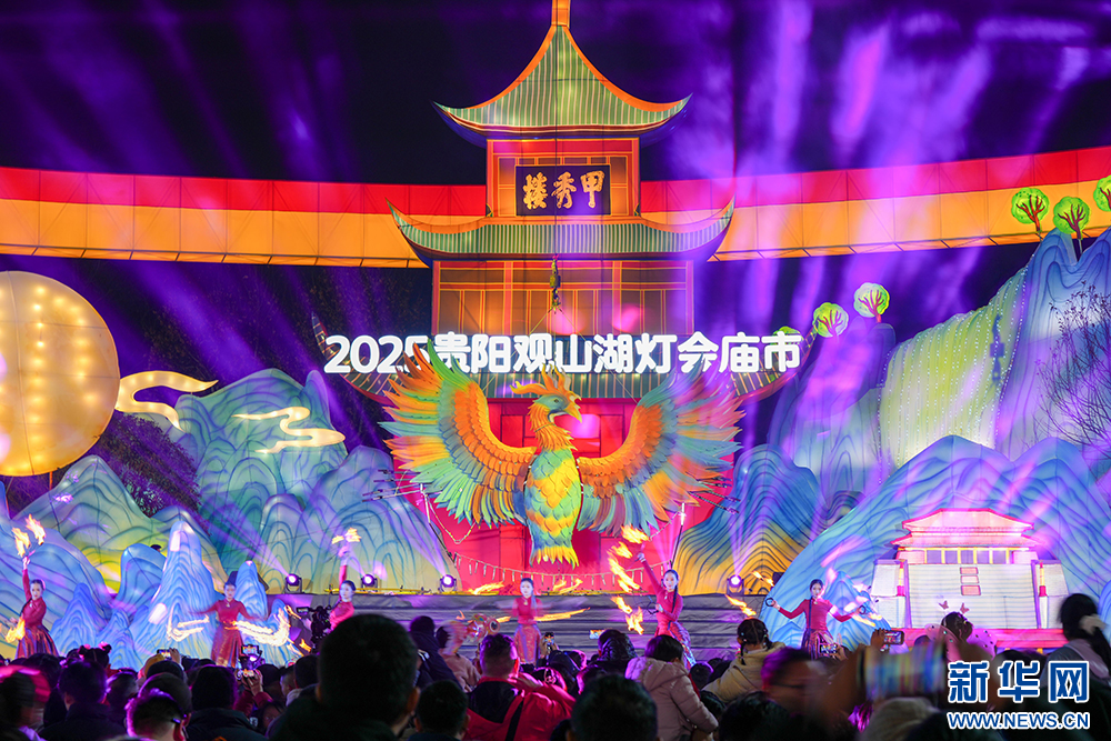 1月22日,演艺人员在2025贵阳观山湖灯会庙市现场表演。新华网发(龙建睿 摄)