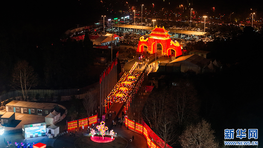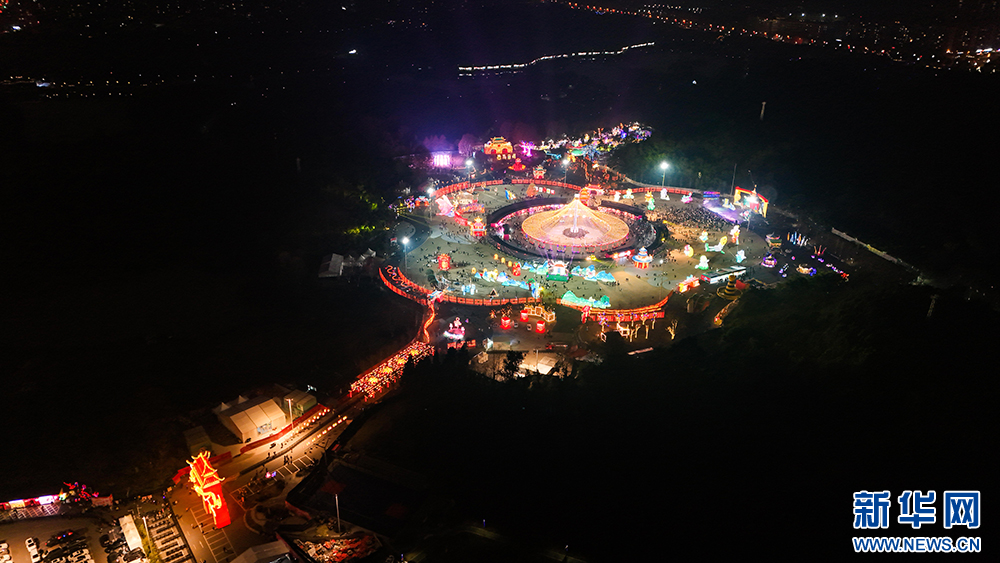 这是1月22日在贵州省贵阳市观山湖公园拍摄的2025贵阳观山湖灯会庙市(无人机照片)。新华网发(龙建睿 摄)