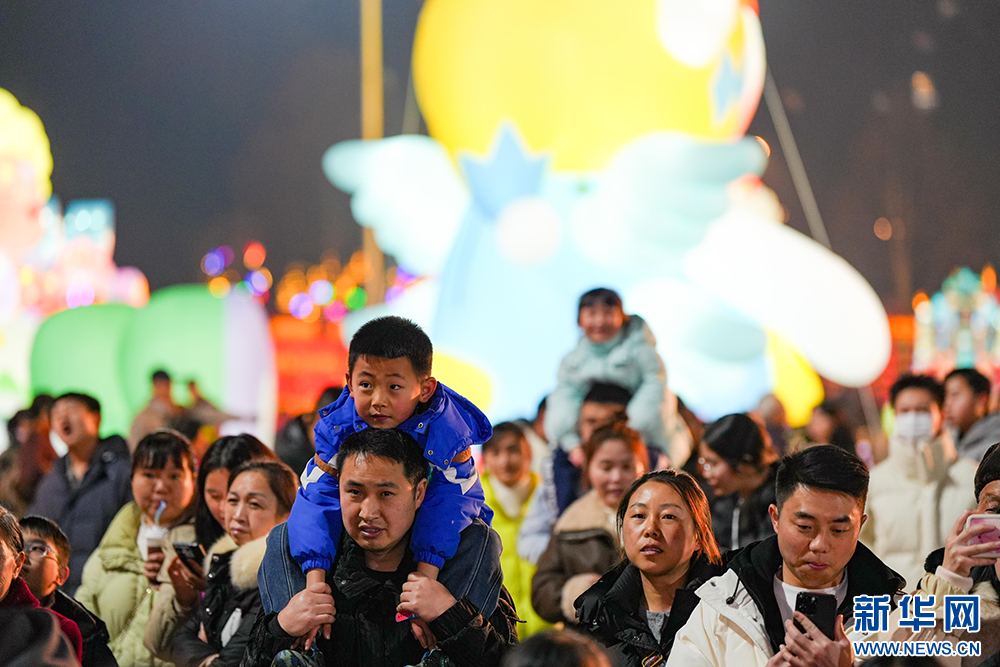 1月22日,小朋友们在2025贵阳观山湖灯会庙市现场观看表演。新华网发(龙建睿 摄)