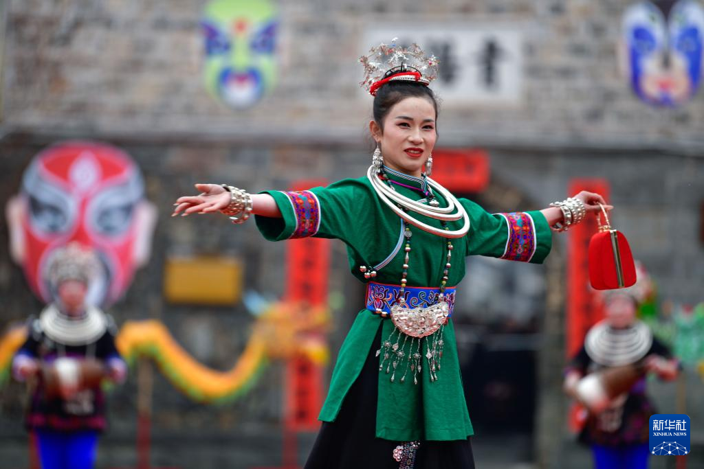 2月11日,演员在贵州省锦屏县隆里古城举办的“村晚”活动中展示民族服饰。新华社记者 杨文斌 摄