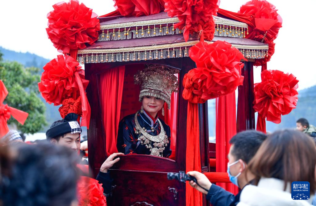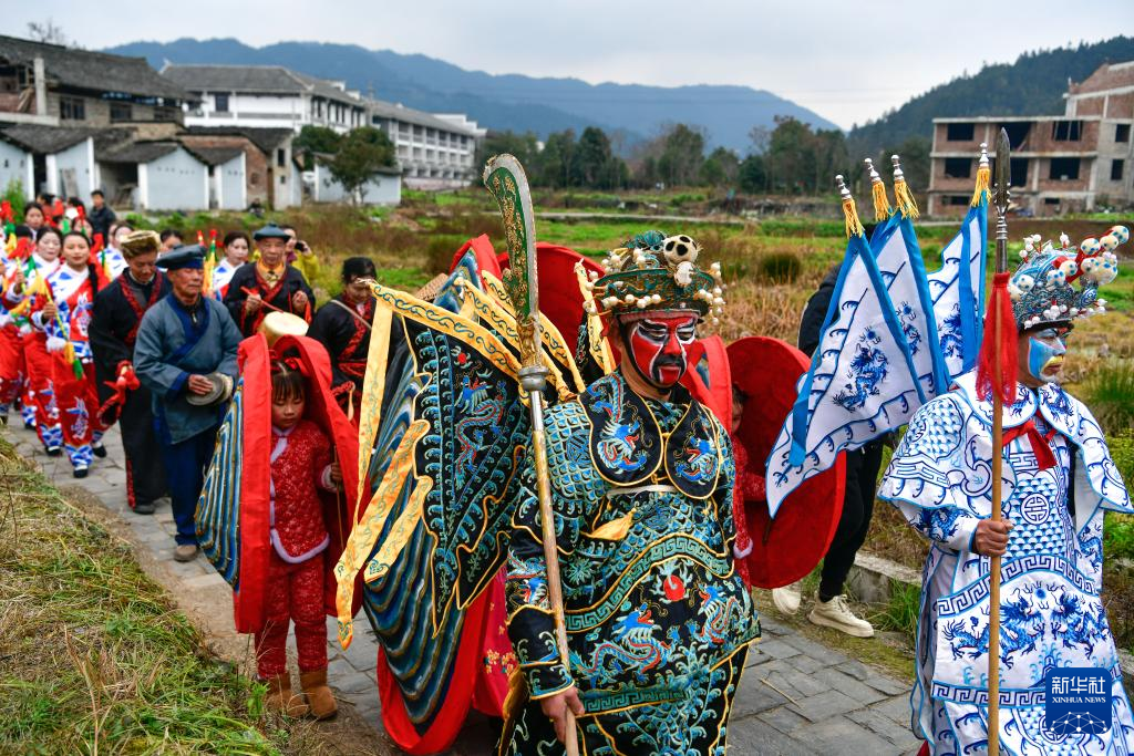 2月11日,迎亲表演队在贵州省锦屏县隆里古城参加“村晚”巡游活动。新华社记者 杨文斌 摄
