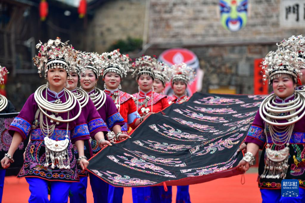 2月11日,少数民族同胞在贵州省锦屏县隆里古城举办的“村晚”活动中展示民族刺绣。新华社记者 杨文斌 摄