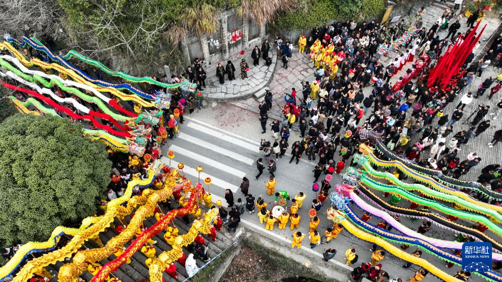 2月11日,人们在贵州省锦屏县隆里古城举办的“村晚”巡游活动中舞龙(无人机照片)。新华社记者 杨文斌 摄