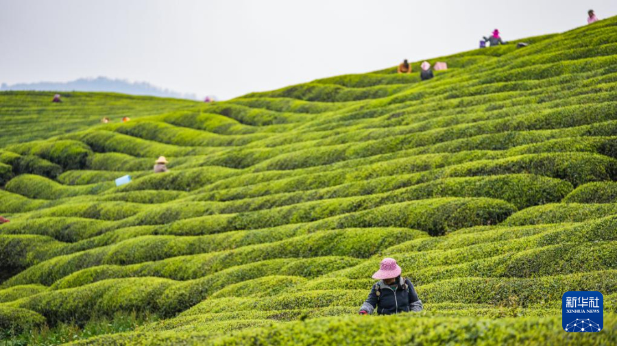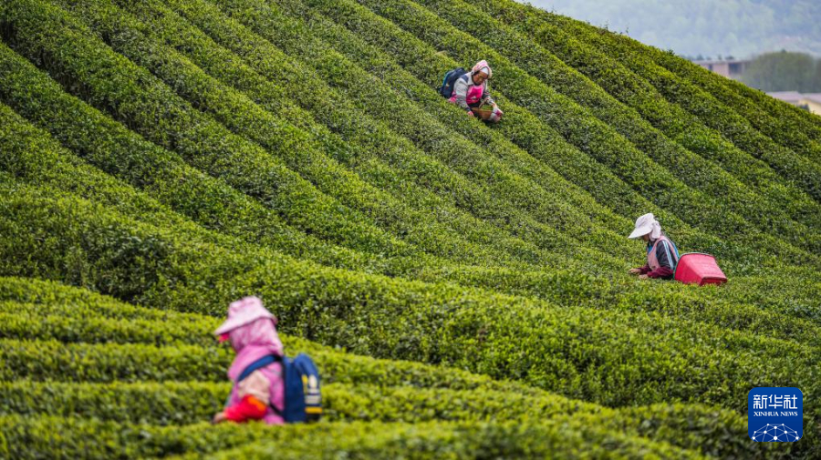 4月4日,茶农在贵州省安顺市西秀区双堡镇山京茶场采茶。新华社记者 陶亮 摄