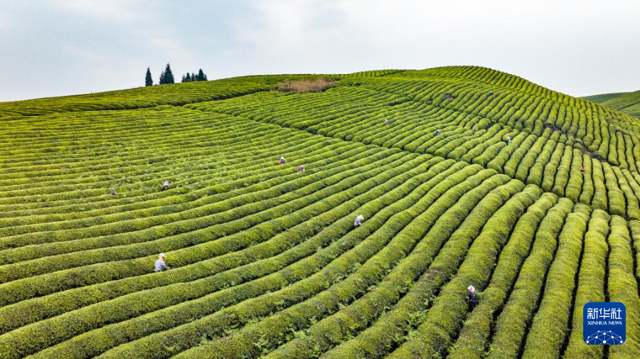 4月4日,茶农在贵州省安顺市西秀区双堡镇山京茶场采茶(无人机照片)。新华社记者 陶亮 摄