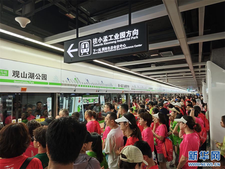 6月15日,贵阳马拉松参加者乘坐地铁离开赛场。新华网 黄勇 摄